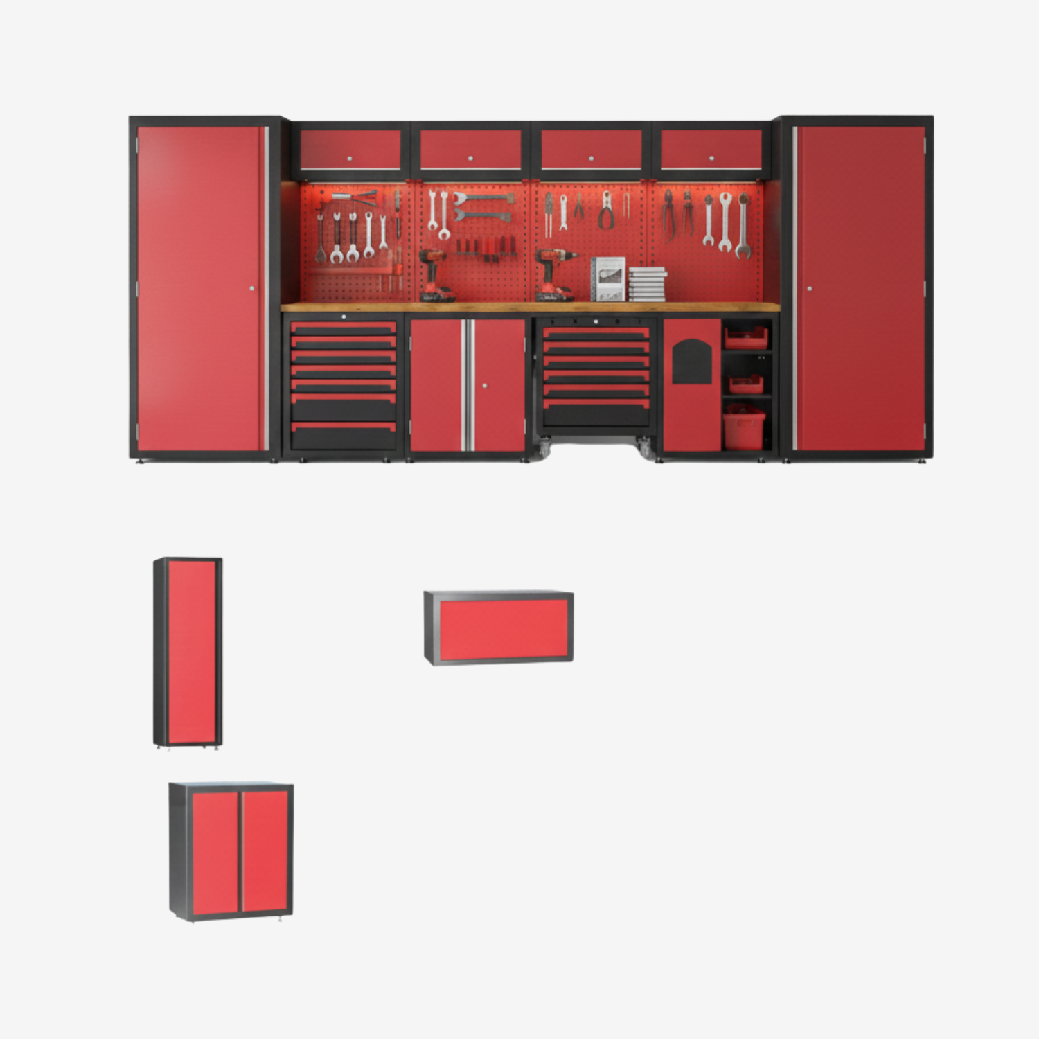 نظام خزانة أدوات احترافية متحركة للورش والمرائب مع طاولة عمل مدمجة مصمم لتنظيم الأدوات وتسهيل العمل اليومي داخل garage et atelier. يوفر هذا النظام مساحة تخزين ذكية مع أدراج قوية، وسطح عمل متين يسمح بإجراء عمليات الصيانة والإصلاح بكفاءة عالية.