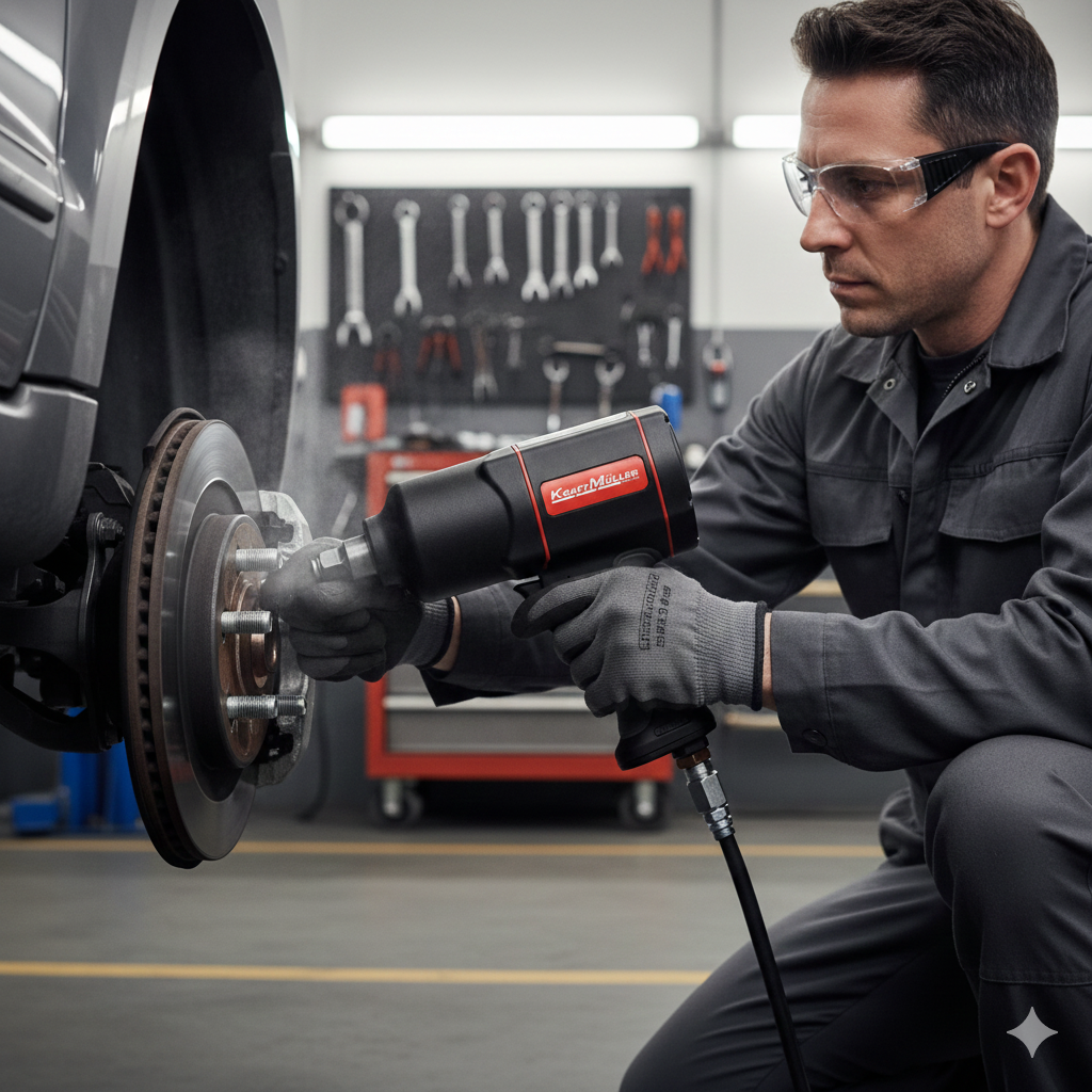مفتاح الربط الصدمي الهوائي من KRAFT MULLER هو أداة قوية ومتينة مصممة خصيصًا لتوفير عزم دوران عالٍ لفك وربط الصواميل والمسامير العنيدة أو الكبيرة بسرعة وكفاءة، ويُعد أداة أساسية في ورش السيارات، ومحلات إصلاح الإطارات، والتجميعات الصناعية الثقيلة. تتميز هذه الأداة بتصميمها الأسود القوي والمدمج مع لمسات حمراء، ومقبض مريح مصمم على شكل مسدس يسهل الإمساك به والتحكم فيه، مع وجود زناد للتشغيل. يعمل هذا المفتاح عن طريق الهواء المضغوط، حيث يتصل بضاغط هواء عبر خرطوم خاص لتشغيل الآلية الداخلية التي تولد سلسلة من الضربات الدورانية السريعة جدًا (الصدمات)، مما يسمح بفك المسامير المشدودة بقوة أو الصدئة بسهولة تفوق المفاتيح اليدوية بكثير. هذه الميزة تجعله مثاليًا للعمليات التي تتطلب سرعة وقوة عالية مثل إزالة صواميل عجلات السيارات أو تفكيك المحركات الكبيرة.