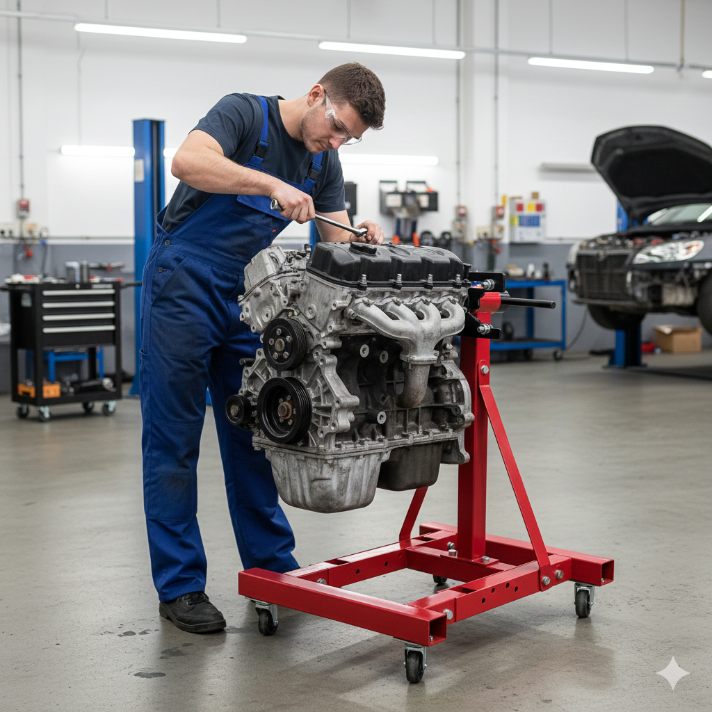 يُستخدم هذا الحامل لتثبيت المحرك خارج السيارة بطريقة آمنة، مما يسهّل عمليات الإصلاح، التنظيف، الصيانة أو إعادة تجميع المحرك. يعدّ ضروريًا لكل ميكانيكي أو ورشة تبحث عن أداء موثوق مع قدرة تحمل عالية.
