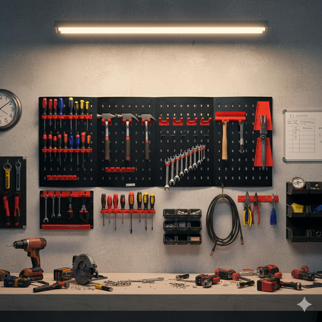 Ce mur d'outils comprend un total de trois plaques perforées (chacune ayant les dimensions de 60 X 40 X 2 cm) muraux perforés qui peuvent être montés côte à côte ou dans toute autre forme sur le mur et combinés. Mettez de l'ordre dans vos outils, que ce soit dans l'atelier, le garage, le sous-sol ou autre et est considéré comme un ensemble de mur de trous d'outils professionnel. . Cet ensemble vous offre plusieurs possibilités