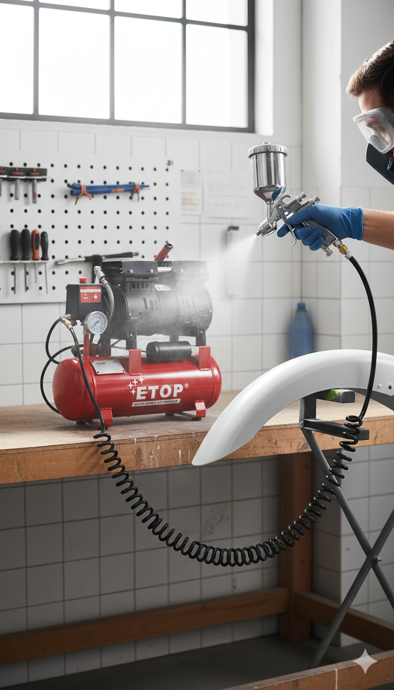كمبريسور هوائي احترافي من ETOP يتميز بتقنية ضغط قوية وصوت منخفض، مما يجعله مناسبًا للاستخدام المنزلي والمهني.