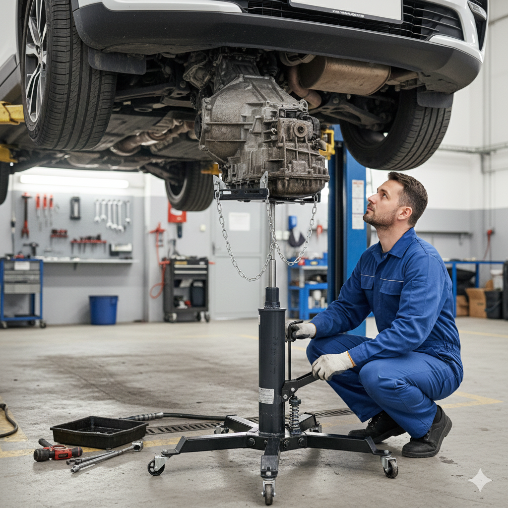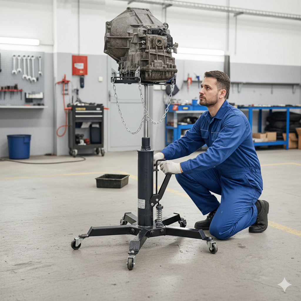 هذا الرافعة الهيدروليكية مخصصة لرفع نواقل الحركة، صناديق التروس أو الدفرنسات — مثالية عند فك أو تركيب ناقل حركة في سيارة أو شاحنة خفيفة.