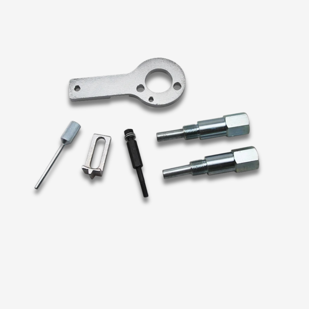 هذا المنتج هو طقم أدوات متخصص وضروري لضبط توقيت محركات فوكسهول (Vauxhall) أو أوبل (Opel)، وهو مُصمم لإنجاز عمليات صيانة نظام التوزيع بكفاءة عالية، وخاصة عند تغيير حزام أو سلسلة التوقيت. يأتي الطقم مُنظَّماً داخل حقيبة بلاستيكية متينة (تظهر باللونين الأزرق والأحمر في الصور) لحماية الأدوات المعدنية. تتكون الأداة الأساسية من قوالب تثبيت لعمود الكامات (Camshaft Locking Tools) ومثبتات لعمود المرفق (Crankshaft Pins/Tools)، وغالباً ما تكون على شكل مسطحات معدنية سوداء أو دبابيس فضية، وهي مصممة لتتطابق تماماً مع نقاط القفل الميكانيكية الخاصة بمحركات فوكسهول. وظيفة هذا الطقم هي ضمان التزامن المثالي والدقيق للمحرك، مما يمنع حدوث أي ضرر لمكوناته الحساسة ويحافظ على مواصفات المصنع بعد الإصلاح.
