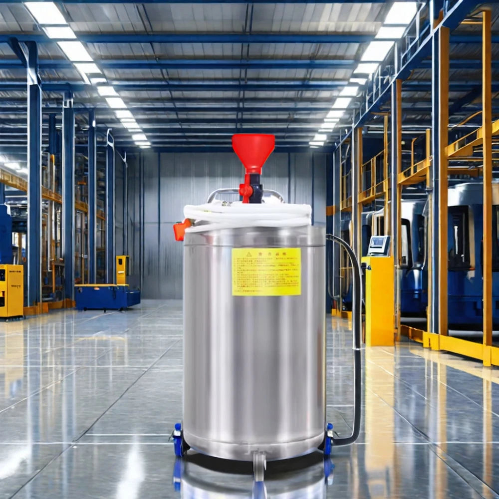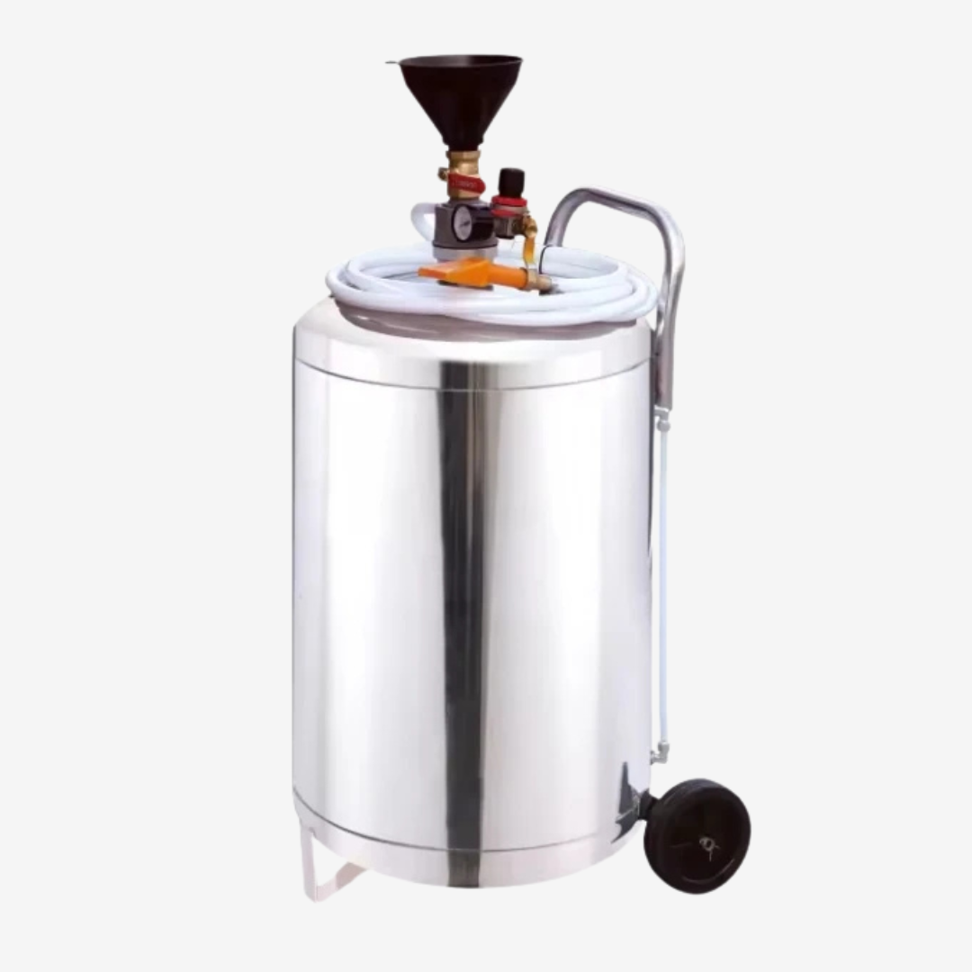 هذا الجهاز هو بخاخ رغوة هوائي احترافي (Professional Pneumatic Foam Sprayer)، يُستخدم في ورش غسيل وتجميل السيارات لإنتاج رغوة سميكة وكثيفة لتغطية المركبة بالكامل. يتميز الجهاز بـ هيكل أسطواني من الفولاذ المقاوم للصدأ (Stainless Steel)، مما يجعله مقاومًا للتآكل الناتج عن المواد الكيميائية والرطوبة، وبسعة كبيرة تصل إلى حوالي 80 لترًا. يعتمد تشغيله على الهواء المضغوط، حيث يتم توصيله بضاغط هواء خارجي لتوليد الضغط اللازم لرش الرغوة عبر خرطوم وفوهة. يتميز الجهاز بوجود قمع (Funnel) وصمامات تحكم، بالإضافة إلى عجلات (Wheels) ومقبض علوي لسهولة نقله داخل محطة الغسيل. يُعد هذا الجهاز ضروريًا لتقديم خدمة غسيل احترافية وفعالة.