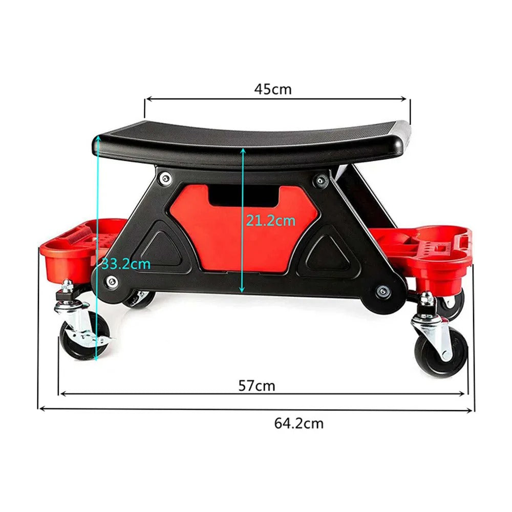 Le tabouret mécanique est un siège pratique et mobile conçu pour les travaux de maintenance et de réparation. Il est équipé de quatre roulettes, dont deux avec frein, ce qui facilite son déplacement et son immobilisation dans la position souhaitée. Son design bas permet de réduire les efforts liés à la flexion fréquente, offrant ainsi un meilleur confort pour le dos et les genoux. Il dispose également de compartiments de rangement pour organiser les outils et autres accessoires nécessaires lors des réparations. Ce tabouret est robuste, supportant un poids élevé, ce qui le rend adapté à une utilisation régulière dans les garages et ateliers.