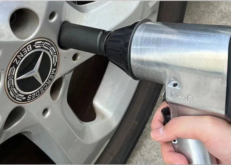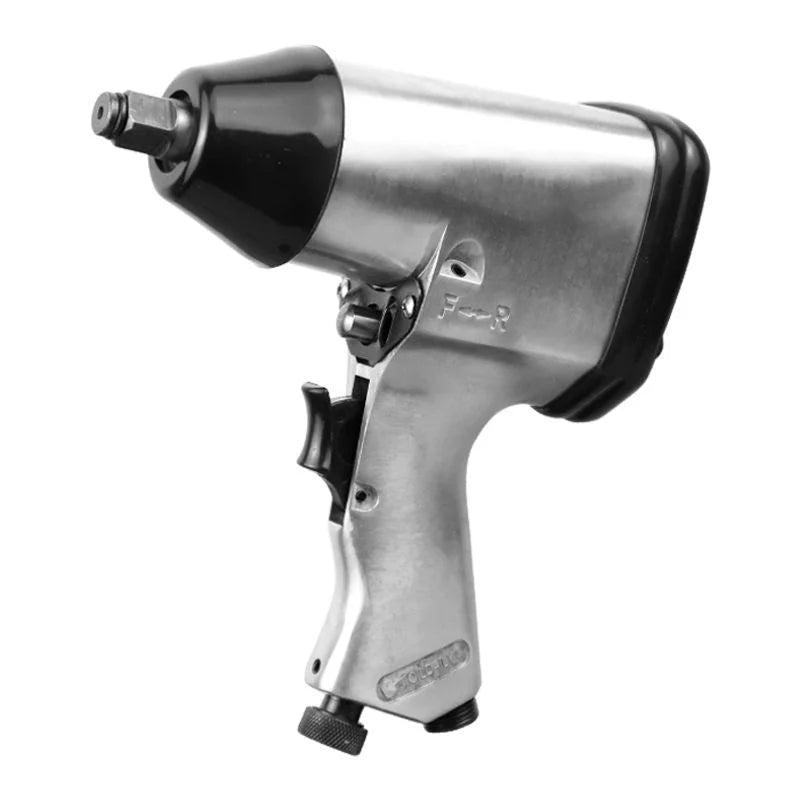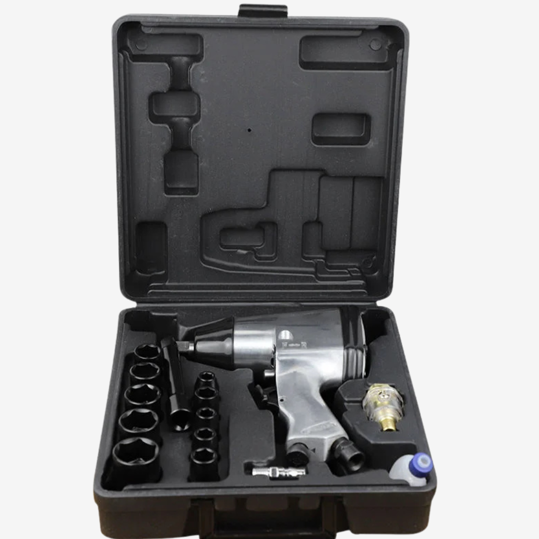 هذا الجهاز هو مفتاح ربط صدمي هوائي (Pneumatic Impact Wrench) مدمج وقوي، ويُعتبر أداة أساسية في ورش صيانة السيارات لفك وشد البراغي والصواميل بسرعة وفعالية عالية. يعمل هذا المفتاح بـ الهواء المضغوط، ويتميز بخفة وزنه وقدرته على توليد عزم دوران (Torque) يصل إلى 320 نيوتن متر، مما يجعله مثاليًا لأعمال صيانة العجلات وتفكيك مكونات المحرك والتعليق في غالبية السيارات الصغيرة والمتوسطة. يأتي المفتاح مزودًا بمأخذ قياسي بحجم 1/2 بوصة (1/2") ليناسب المقابس (Sockets) الأكثر شيوعًا. تظهر المجموعة (في الصندوق الأسود المرفق) على الأرجح وهي تحتوي على المفتاح نفسه ومجموعة من المقابس بأحجام مختلفة، ووصلة هواء سريعة لربطه بخرطوم الضاغط.
