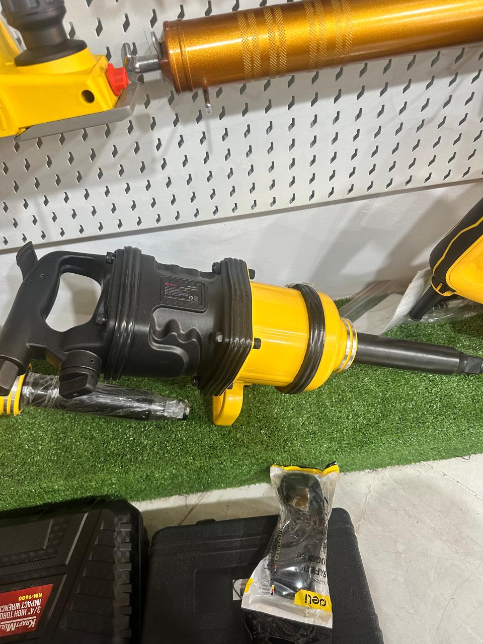 ذا الجهاز هو مفتاح ربط صدمي هوائي (Pneumatic/Air Impact Wrench) ذو قوة فائقة، وهو مصمم لتوفير عزم دوران (Torque) عالٍ جدًا، مما يجعله الأداة المثالية لفك وشد صواميل العجلات الكبيرة والمسامير الثقيلة في الشاحنات والحافلات والمعدات الثقيلة. يتميز الجهاز بأنه يعمل بالهواء المضغوط، مما يمنحه قوة أكبر وعزمًا أعلى مقارنة بالأدوات الكهربائية المماثلة. يتميز مفتاح الصدم هذا بتصميم قوي ومتين باللونين الأصفر والأسود، وله مأخذ (Square Drive) بحجم 1 بوصة (1 Inch)، وهو مقاس احترافي يُستخدم للمقابس (Sockets) ذات الحجم الكبير جدًا. الجهاز مزود غالبًا بمقبض جانبي طويل لزيادة التحكم، كما أن الهيكل الطويل يسهل الوصول إلى البراغي العميقة. يُعد هذا المفتاح أداة لا غنى عنها في ورش صيانة المركبات التجارية.
