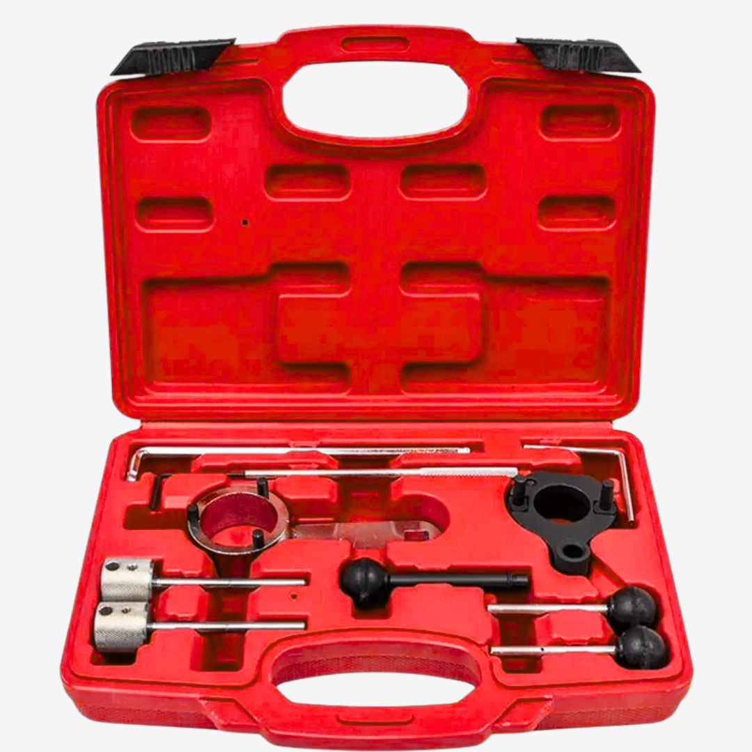 هذه هي مجموعة أدوات حزام/سلسلة توقيت عمود الكامات للمحرك (Engine Camshaft Timing Belt/Chain Tool Kit)، وهي مخصصة لمركبات مجموعة VAG (فولكس فاجن، أودي، سيات، وسكودا). تُستخدم هذه المجموعة الأساسية لتثبيت ومحاذاة مكونات نظام التوقيت بدقة فائقة عند استبدال حزام أو سلسلة التوقيت، أو عند إجراء إصلاحات تتطلب فك رأس الأسطوانة. تتكون المجموعة من عدة قطع معدنية متخصصة، بما في ذلك أدوات قفل ومحاذاة لعمود الكامات (Camshaft Locking Tools) وربما دبوس قفل لعمود المرفق (Crankshaft Pin). هذه الأدوات تضمن تثبيت الأعمدة في وضع التوقيت الصحيح (TDC) بشكل صارم، وهو أمر حيوي لتجنب التلف الميكانيكي للمحرك نتيجة التوقيت الخاطئ. تأتي المجموعة معبأة بشكل منظم في صندوق بلاستيكي قوي باللون الأزرق.