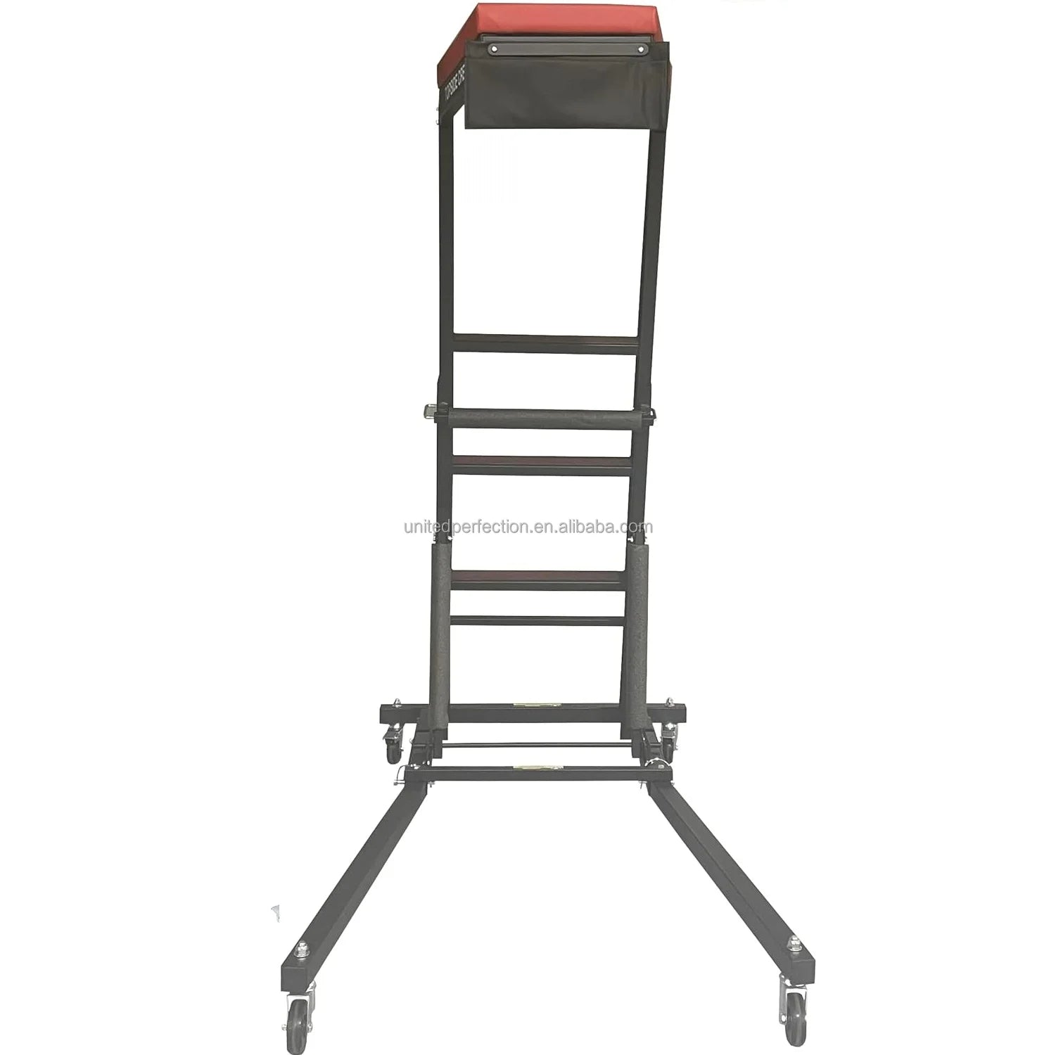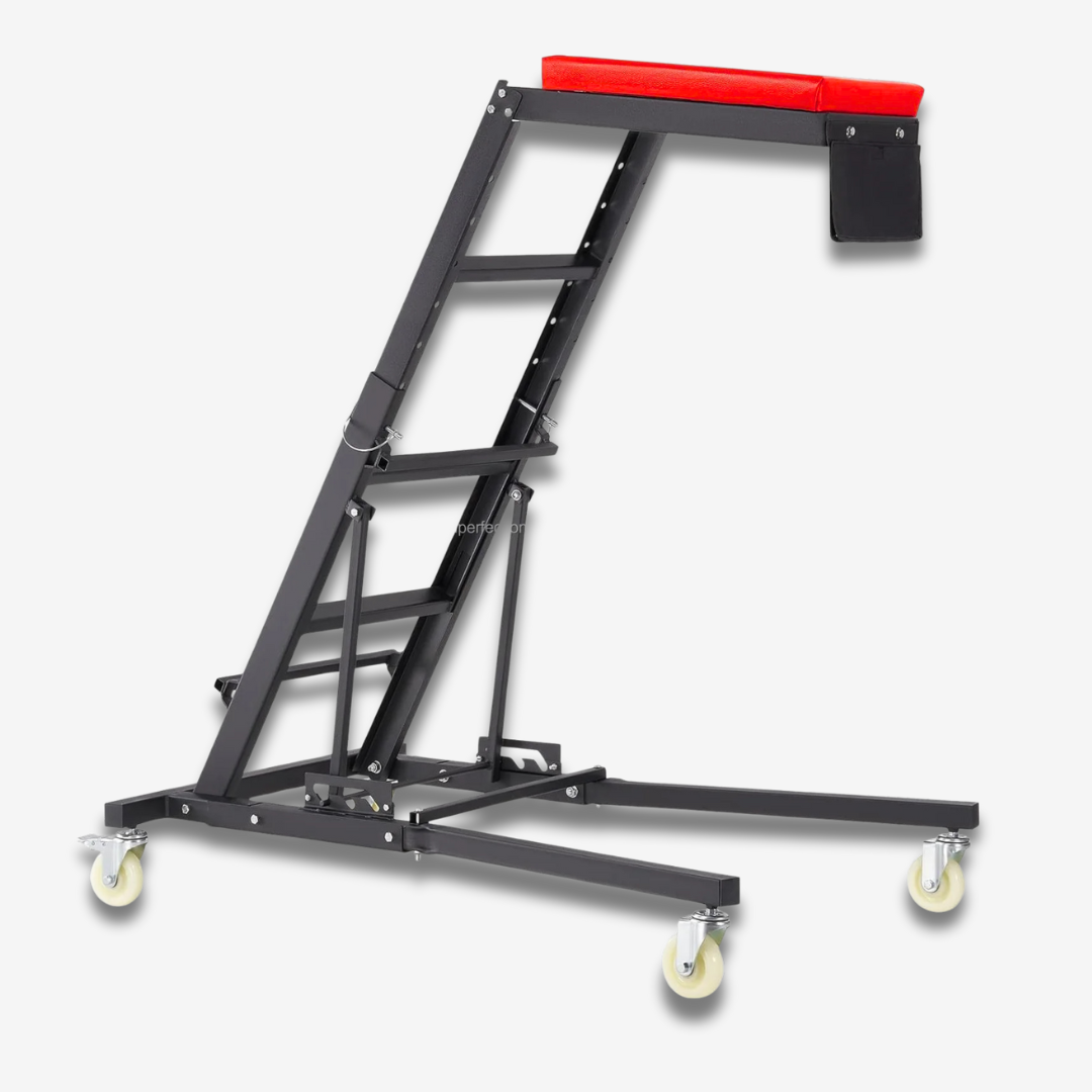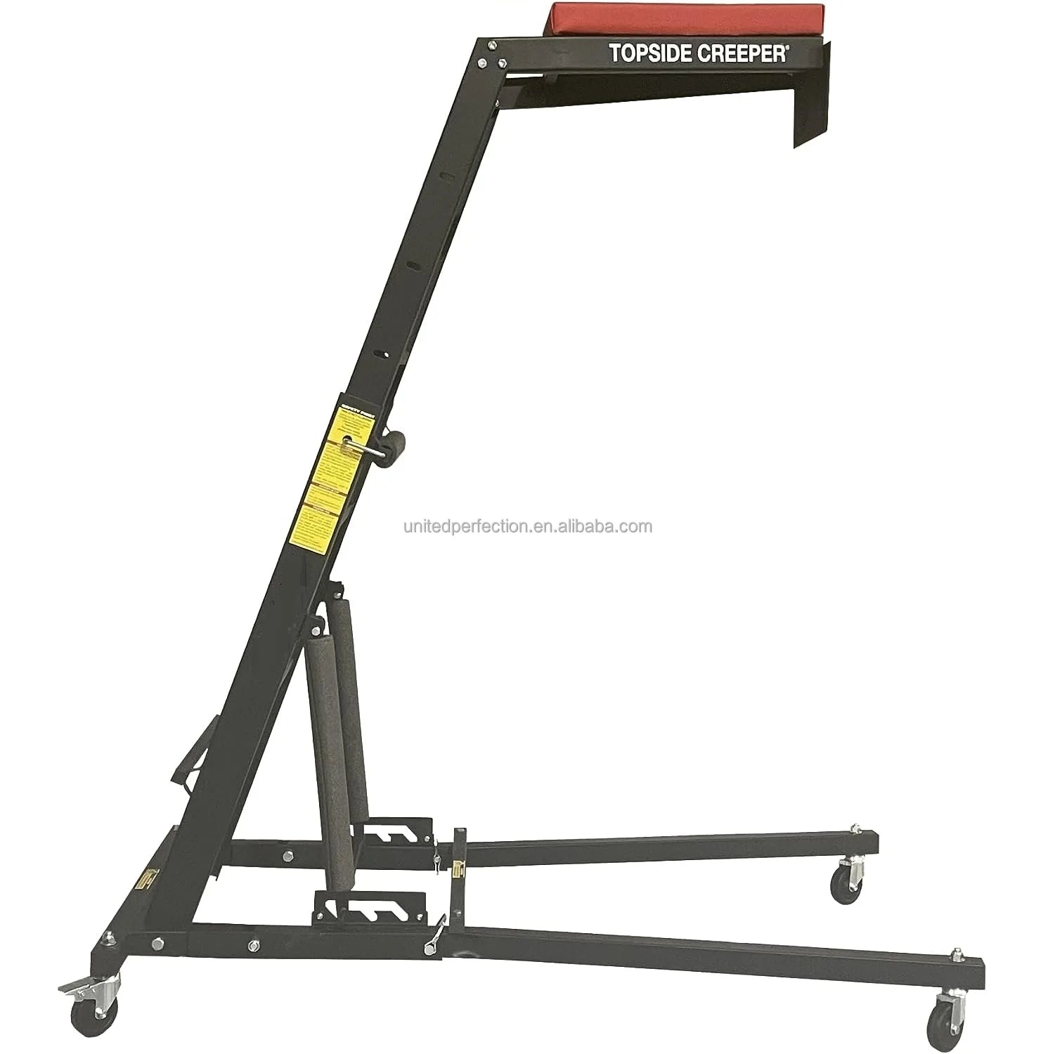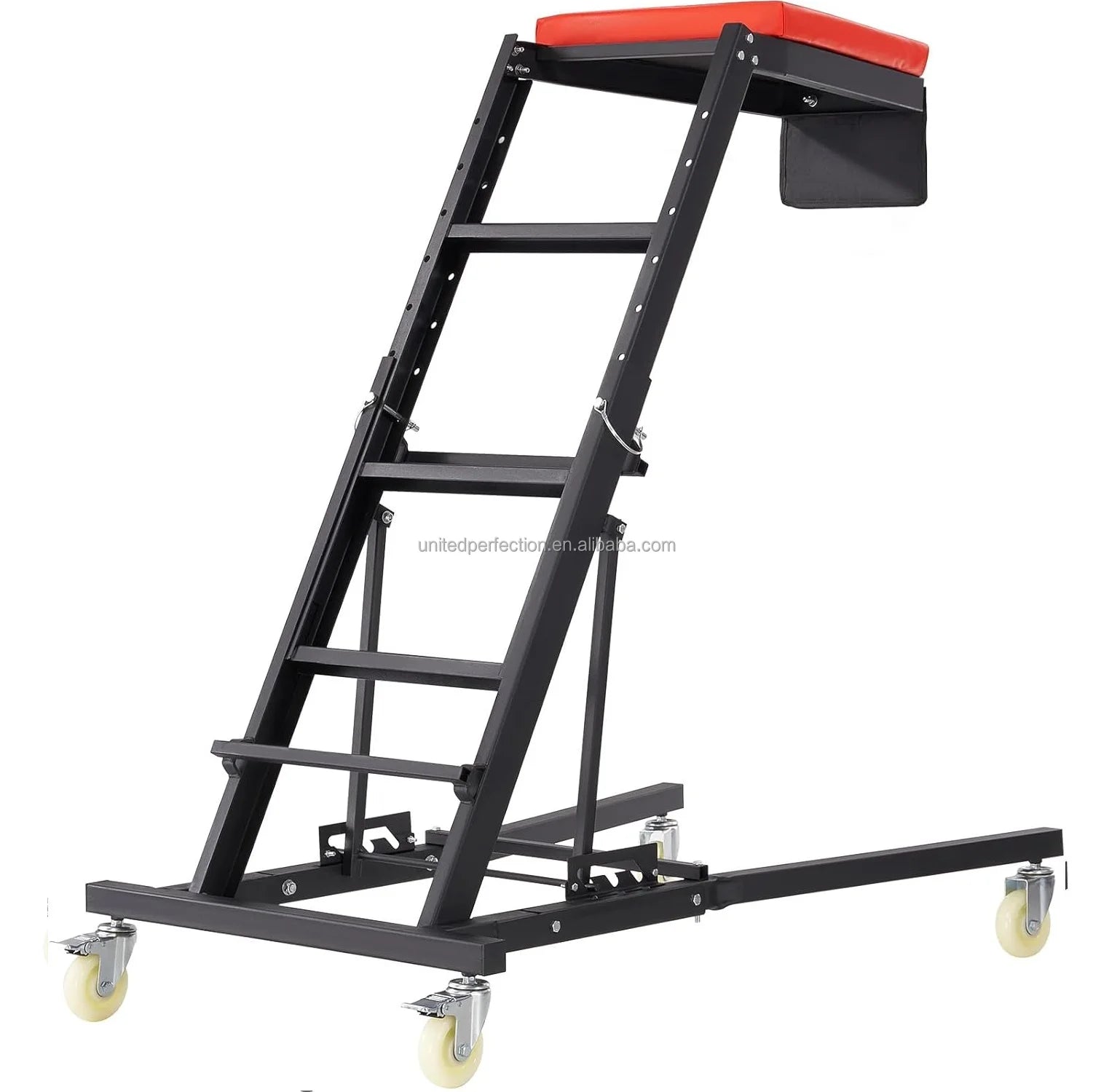 هذا المنتج عبارة عن منصة عمل أو سلم صيانة ميكانيكي عالي المستوى وقابل للتعديل، مصمم خصيصاً لمساعدة الميكانيكيين في الوصول بشكل مريح وآمن إلى المناطق العلوية والعميقة داخل حجرة محرك السيارة، خاصة في الشاحنات الصغيرة أو سيارات الدفع الرباعي. يتكون الهيكل من إطار معدني متين باللون الأسود على شكل سلم تدريجي، وينتهي في الأعلى بمسند أو وسادة مريحة (باللون الأحمر) يستند عليها الفني أثناء العمل. المنصة مزودة بعجلات دوارة (Castors) في الأسفل لسهولة تحريكها وتثبيتها بجوار السيارة، مما يجعلها أداة فعالة لتحسين بيئة العمل وتقليل الإجهاد أثناء إجراء أعمال الصيانة المعقدة على المحرك.