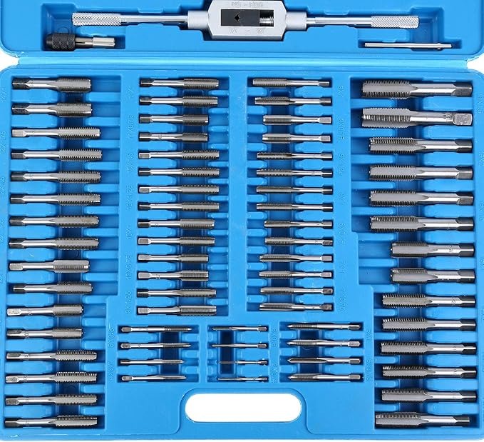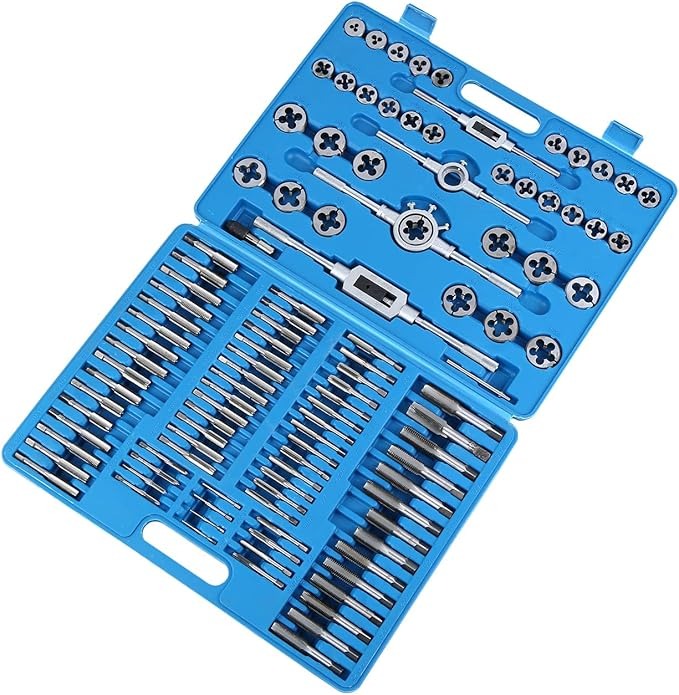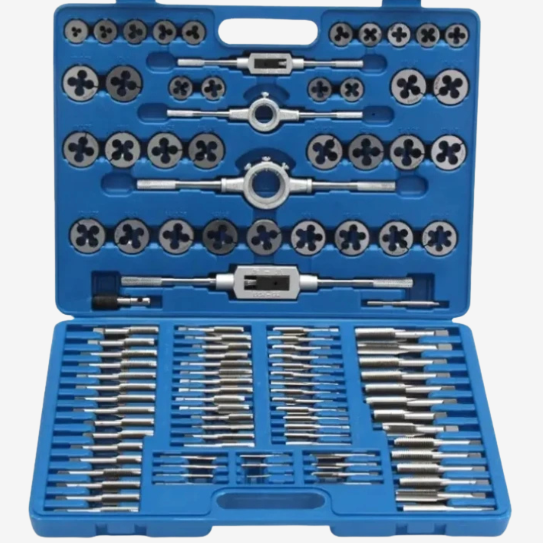 هذه المجموعة هي مجموعة شاملة للولبة وتشكيل الخيوط (Tap and Die Set)، وهي أداة أساسية في أي ورشة صيانة ميكانيكية أو سباكة أو صناعة. تُستخدم هذه الأدوات لتشكيل خيوط (سنون) جديدة داخل الثقوب (باستخدام المغازل/التناكر - Taps) أو خيوط خارجية على الأعمدة أو القضبان (باستخدام القوالب/النواظم - Dies)، كما يمكن استخدامها لإصلاح الخيوط التالفة الموجودة بالفعل. تتميز المجموعة بأنها منظمة بشكل جيد داخل صندوق بلاستيكي أزرق وتحتوي على عدد كبير من الأدوات، بما في ذلك: