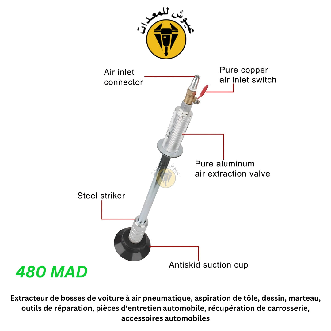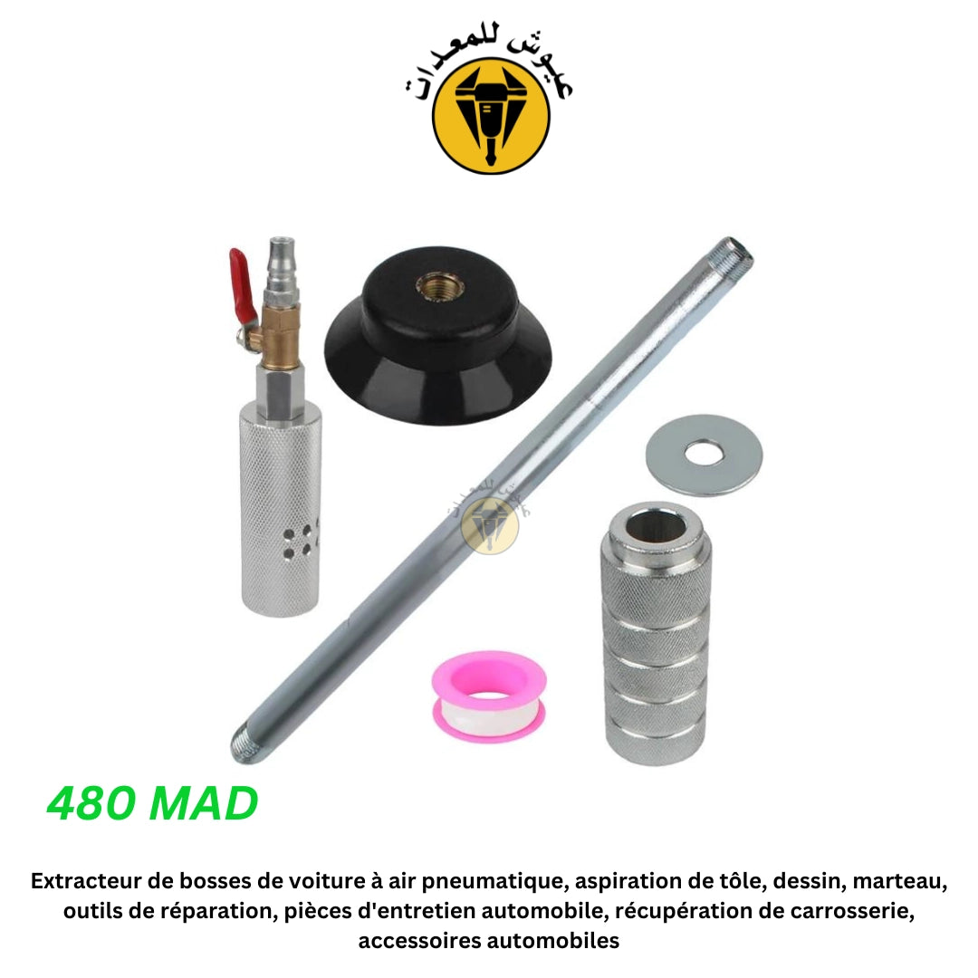 Un kit de réparation de bosses de voiture pneumatique est un ensemble d'outils utilisé pour enlever les bosses sur la carrosserie d'une voiture sans endommager la peinture. Voici les éléments couramment inclus dans un tel kit :