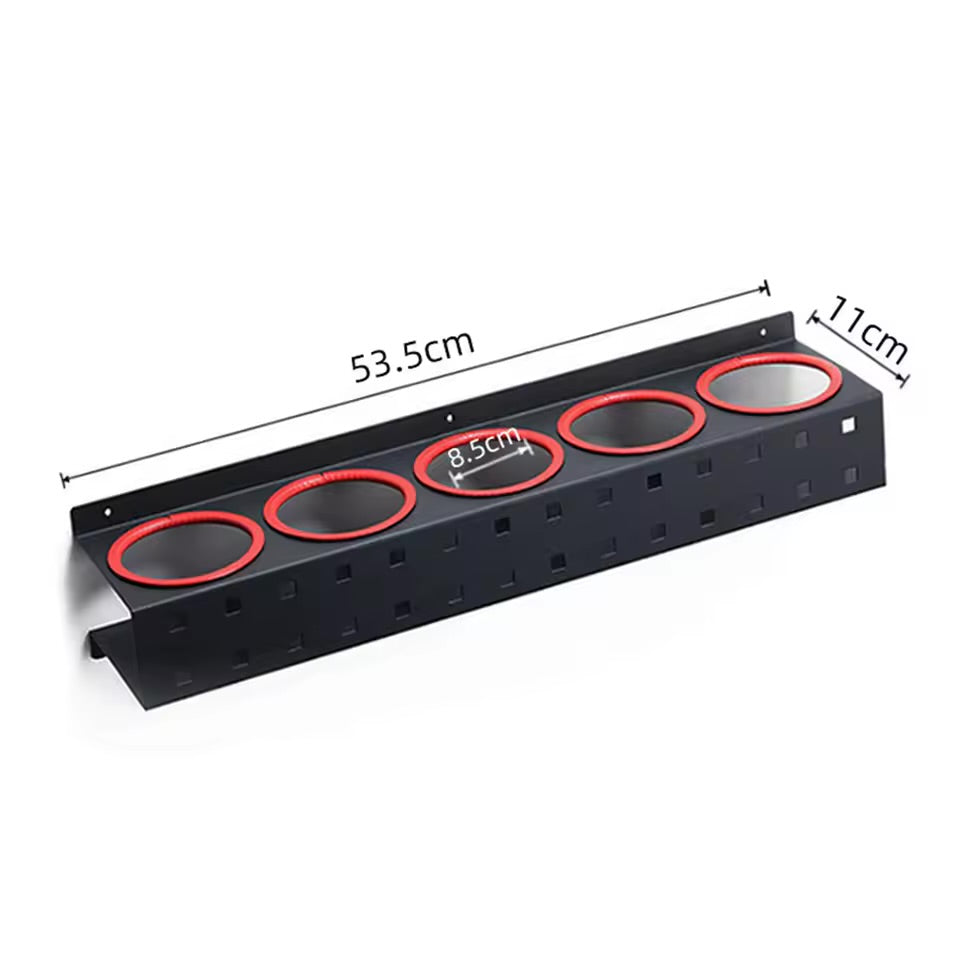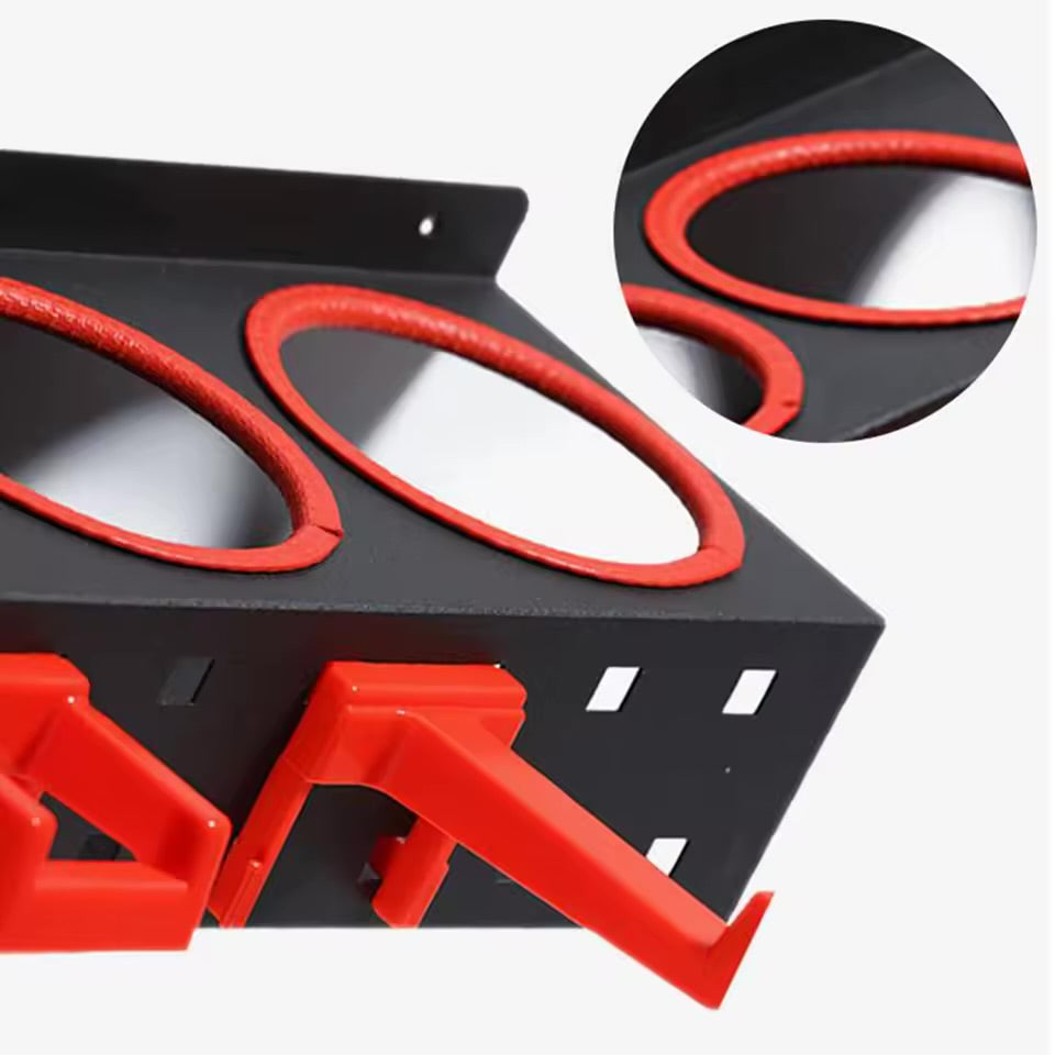 فتحات دائرية (Circular Slots): وهي محاطة بإطارات بلاستيكية أو معدنية حمراء، ومصممة لتثبيت زجاجات الرش (مثل زجاجات المنظفات أو مواد التلميع) بشكل آمن ومنظم، مما يمنع انسكابها ويوفر مساحة عمل نظيفة.