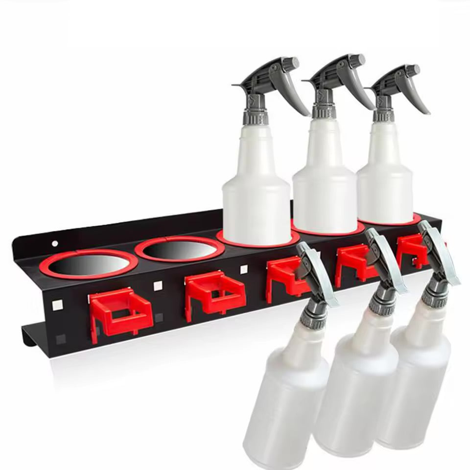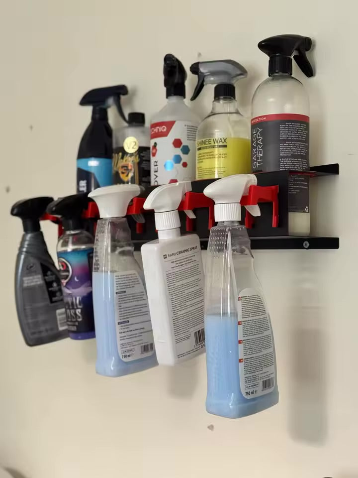 ذا المنتج هو حامل/دعامة تخزين مثبتة على الحائط (Wall Mounted Storage Support)، وهي مصممة خصيصًا لتنظيم وتخزين زجاجات الرش (Spray Bottles) والمناديل/المناشف (حيث يمكن تعليقها على الأذرع السفلية) التي تُستخدم في أعمال صيانة وتجميل وغسيل السيارات (Car Detailing).